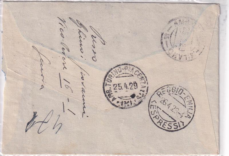 Storia postale. Espresso da Genova 25/04/1929 a Reggio Emilia 26/04/1928
