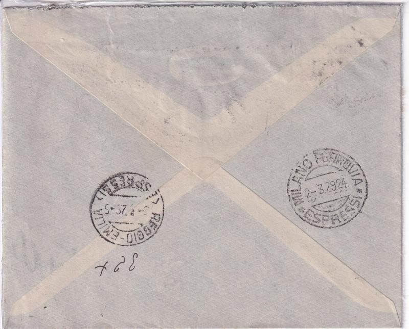 Storia postale. Espresso da Bergamo 02/03/1929 a Reggio Emilia 03/03/1929