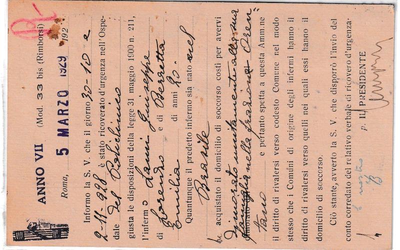 Storia postale. Raccomandata Roma 3385 del 05/10/1929 a Reggio Emilia 06/10/1929