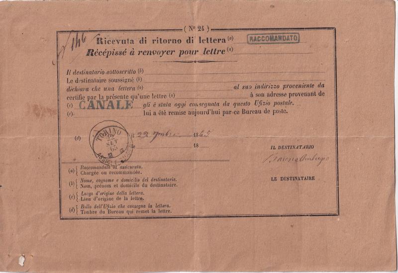 Storia postale. Ricevuta di Ritorno da Canale 21/09/1865 a Torino 22/09/1865