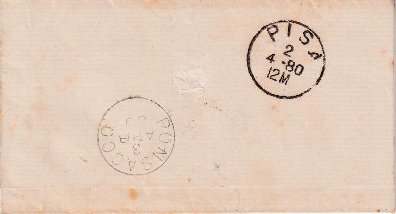 Storia postale Lettera di Servizio da Pisa 02/04/1880 a Ponsacco 03/04/1880