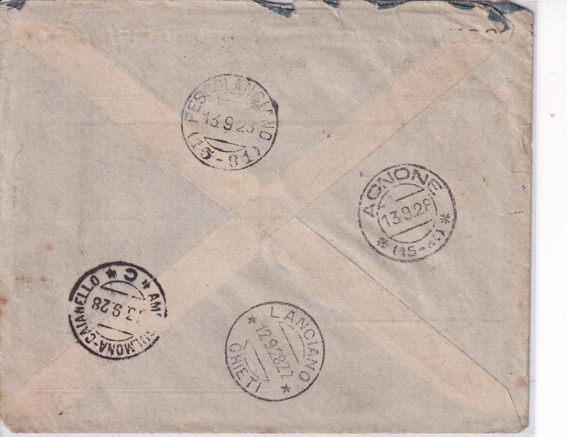 Storia postale. Raccomandata da Roio de Sangro R 765 del 11/09/1928 a Agnone 13/09/1928