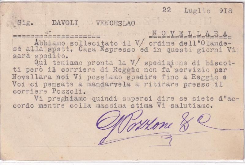 Storia postale. Lettera da Milano 23/07/1918 a Novellara