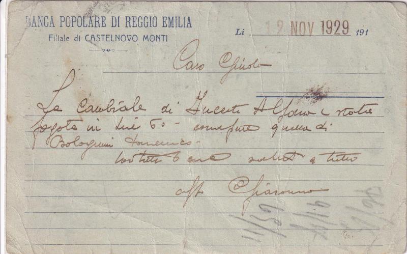 Storia postale. Lettera da Ramiseto 13/11/1929 a Reggio Emilia
