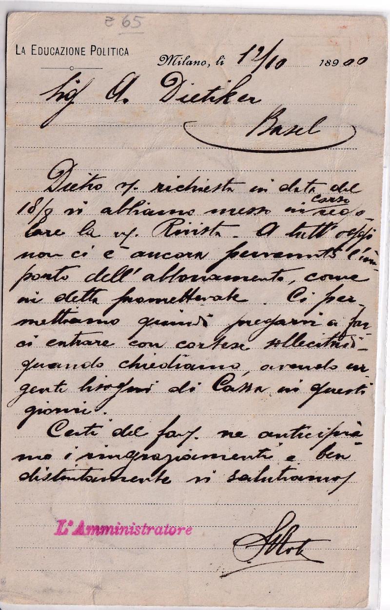 Storia postale. Cartolina postale da Milano 10/10/1900 a Basilea Svizzera