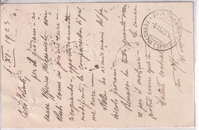 Storia postale. Cartolina postale Espresso da Piacenza 06/11/1923 a Parma 06/11/1923