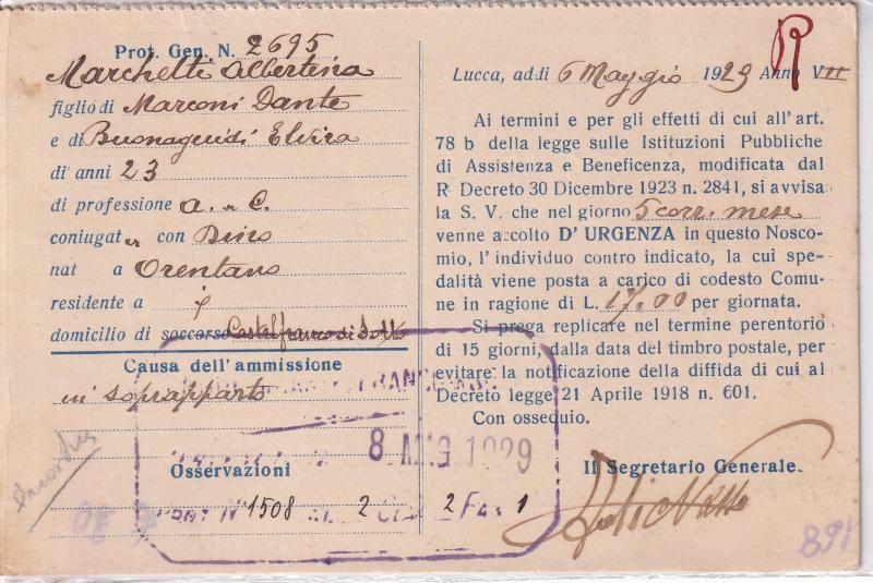 Storia postale. Cartolina Raccomandata da Lucca 2223 del 07/05/1929 a Castelfranco di Sotto 8/05/1929