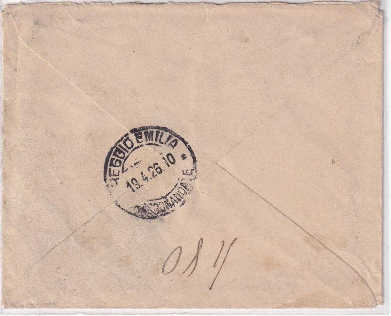 Storia postale. Raccomandata da Villaminozzi 3853 del 18/04/1926 a Reggio Emilia 19/04/1926