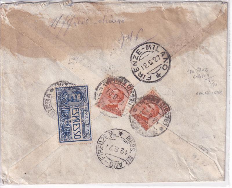 Storia postale. Espresso da Perugia 21/06/1925 a Reggio Emilia 21/06/1925