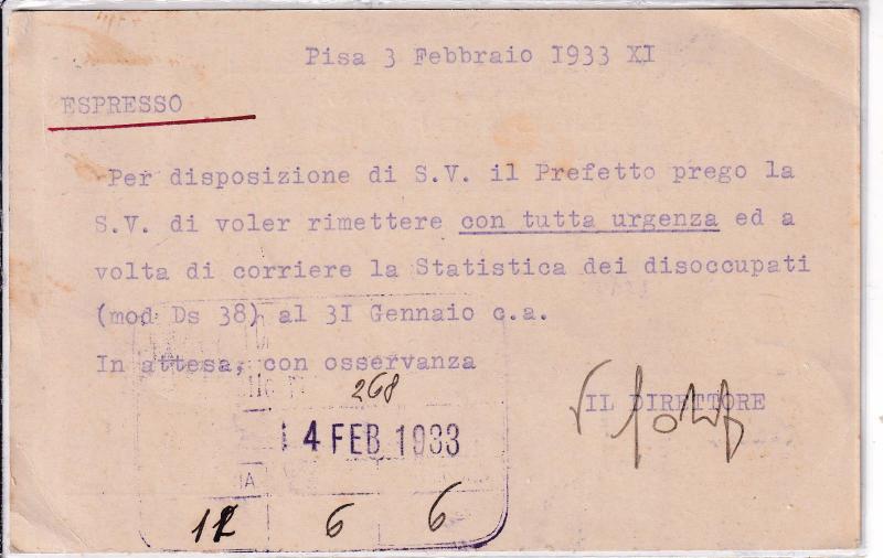 Storia postale. Carolina postale Espresso da Pisa 03/02/1933 a Castelfranco di Sotto 04/02/1933