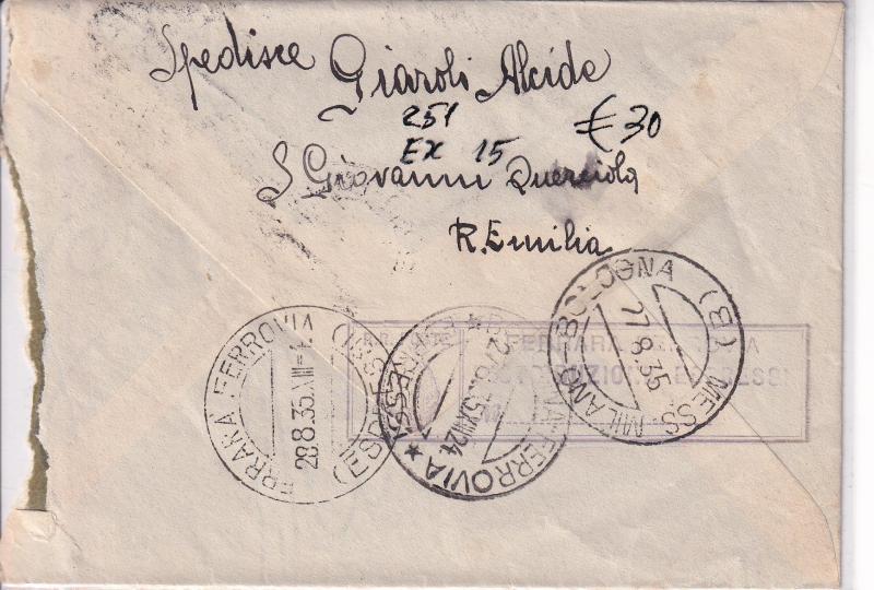 Storia postale. Espresso da Reggio Emilia 27/08/1935 a Ferrara 28/08/1935