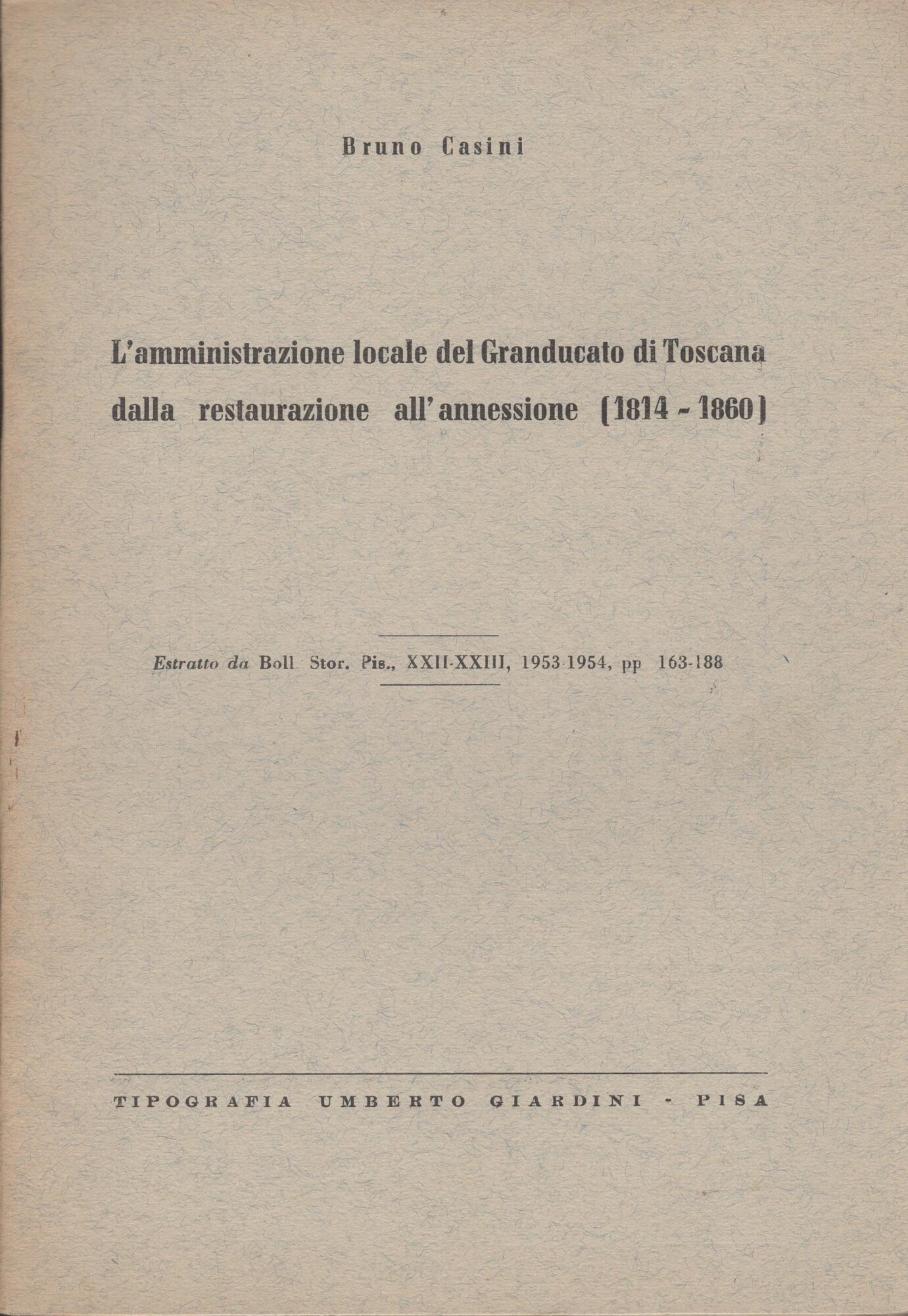 Casini B., L’amministrazione locale del Granducato di Toscana dalla restaurazione all’annessione (1814-1860), Estratto da Boll. Stor. Pis., XXII-XXIII, 1953-1954, pp. 163-188