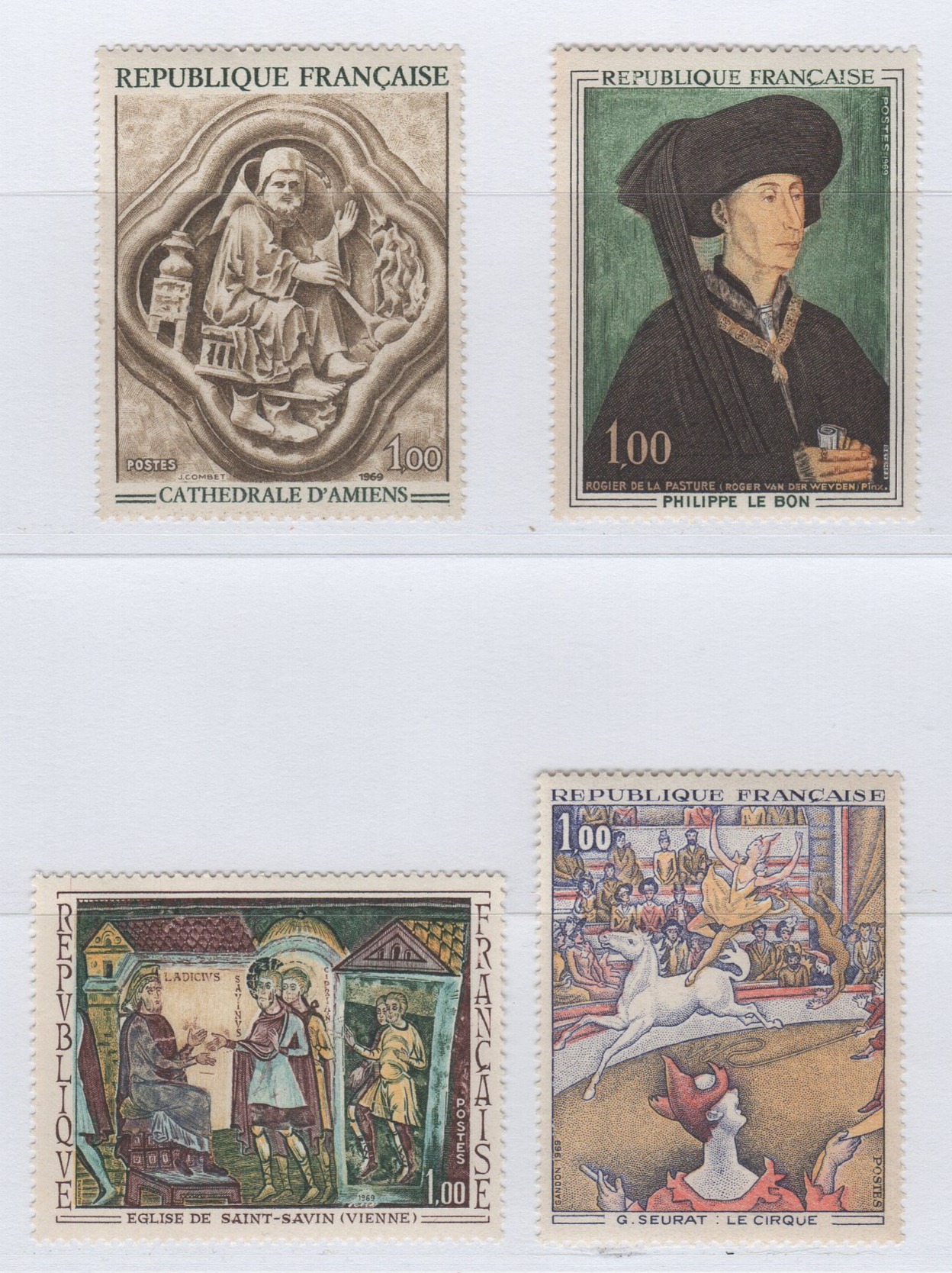Francobolli Francia Anno 1969 Opere d’arte Bassorilievo Cattedrale di Amiens Rogier De La Pasture ‘Filippo Il Buono’ Affresco Chiesa di San Savino di Vienne G. Seurat ‘Il circo’