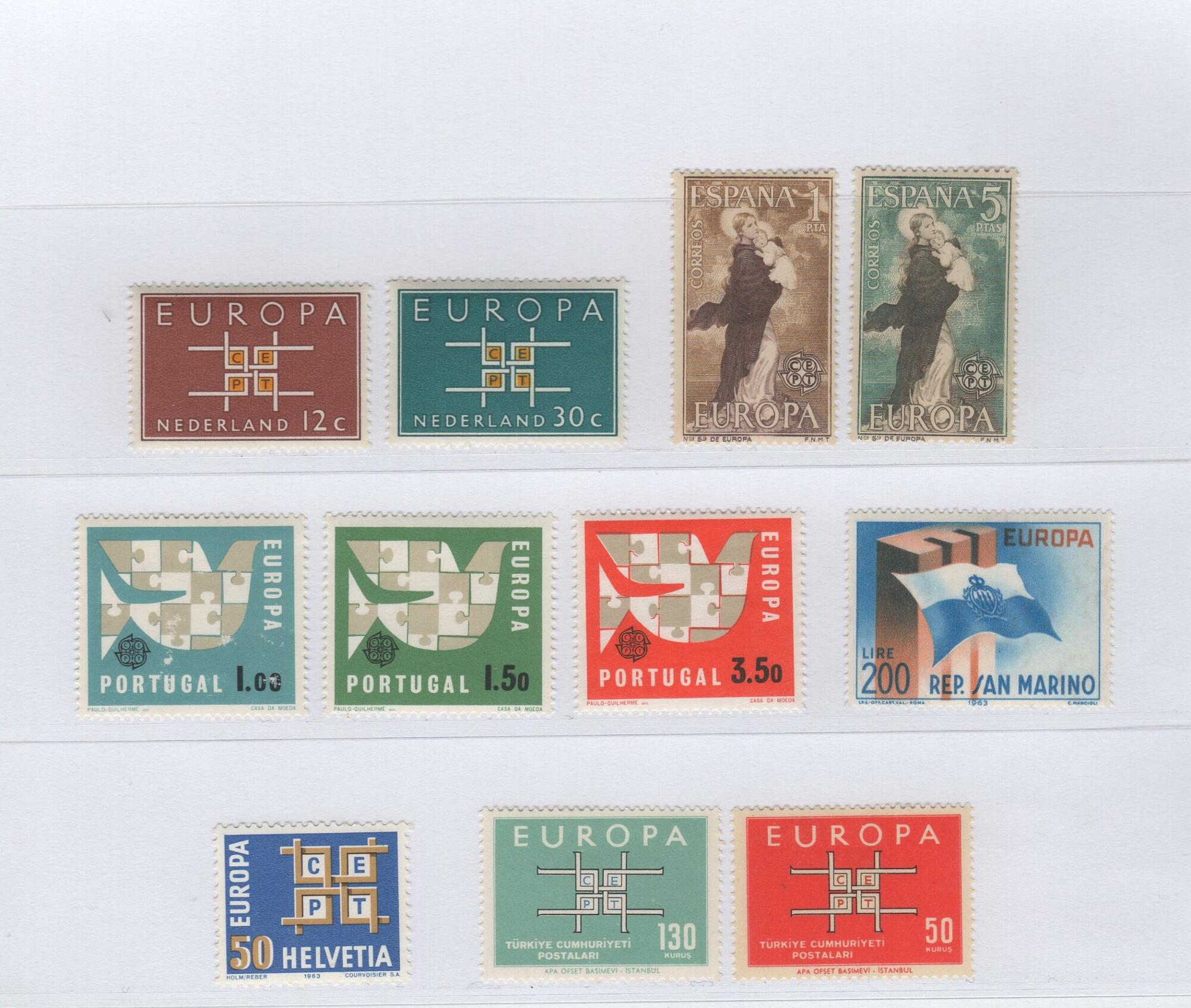 Belgio (cat. n. 1260-1261) Cipro (cat. n. 217-219) Finlandia (cat. n. 556) Francia (cat. n. 1396-1397) Germania (cat. n. 278-279) Grecia (cat. n. 799-800) Irlanda (cat. n. 159-160) Islanda (cat. n. 328-329) Italia (cat. n. 967-968) Liechtenstein (cat. n. 381) Lussemburgo (cat. n. 634) Monaco (cat. n. 618-619) Norvegia (cat. n. 460-461) Olanda (cat. n. 780-781) Portogallo (cat. n. 929-931) San Marino (cat. n. 659) Spagna (cat. n. 1188-1189) Svizzera (cat. n. 716) Turchia (cat. n. 1672-1673)