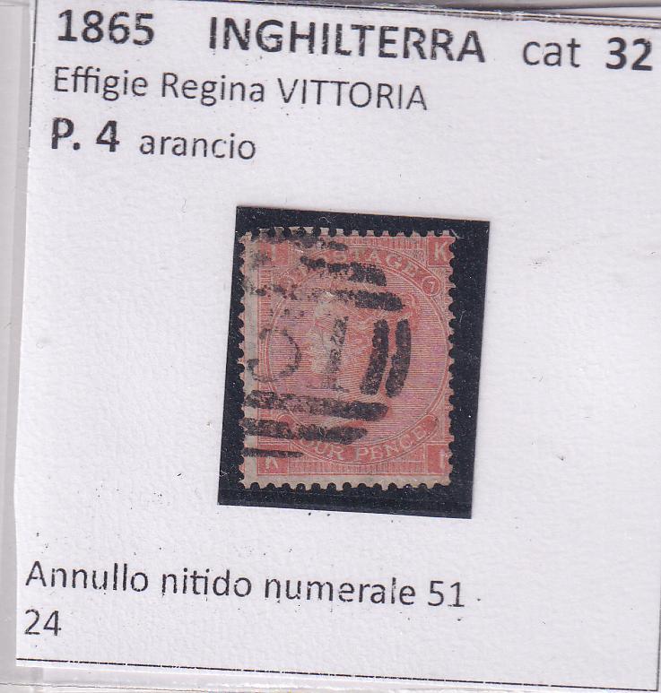 Francobollo Gran Bretagna Anno 1865 Effigie Regina Vittoria P.4 arancio