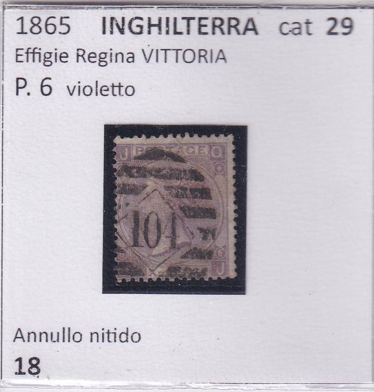 Francobollo Gran Bretagna Anno 1865 Effigie Regina Vittoria P.6 violetto