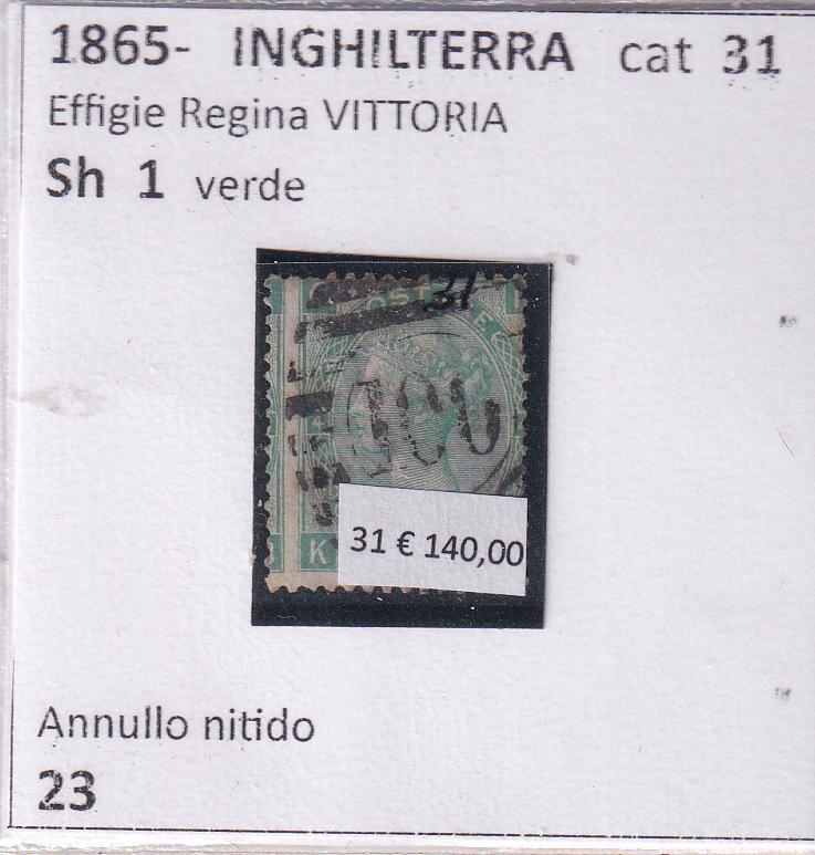 Francobollo Gran Bretagna Anno 1865 Effigie Regina Vittoria Sh.1 verde