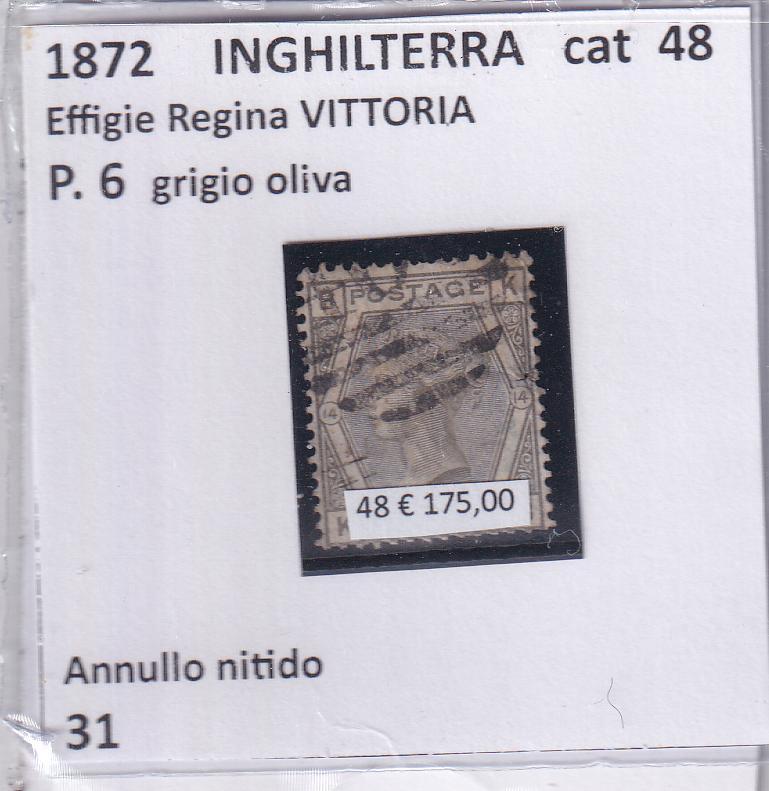 Francobollo Gran Bretagna Anno 1872 Effigie Regina Vittoria P.6 grigio oliva