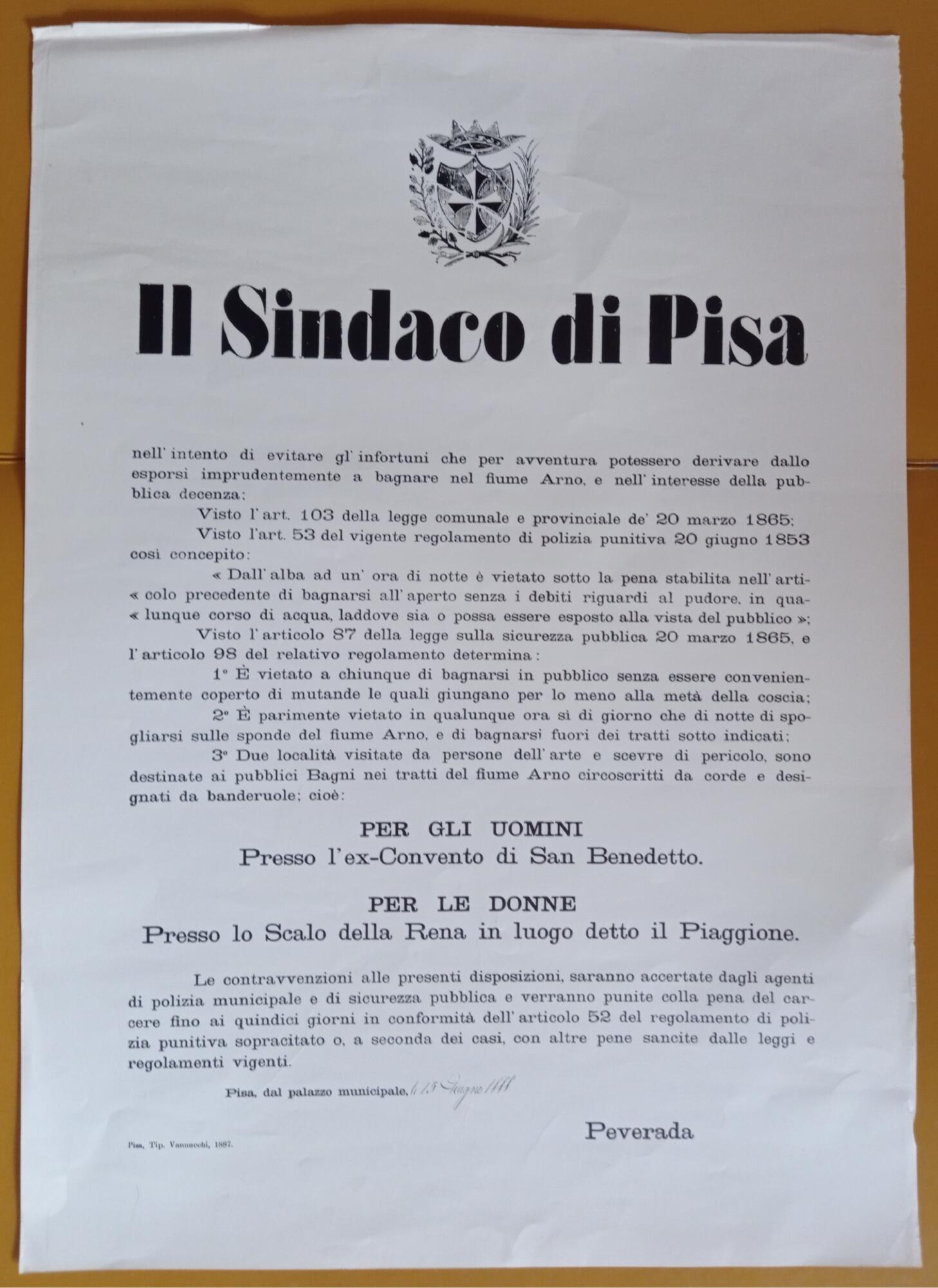 Manifesto con Regolamentazione del Sindaco di Pisa della balneazione in Arno datato 15 Giugno 1888