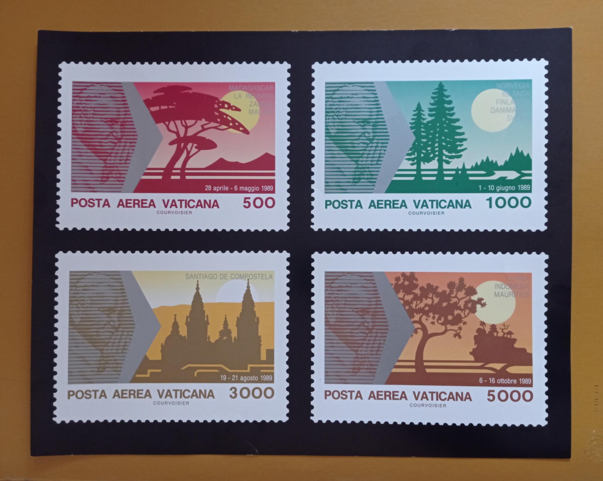 Manifesto con riproduzione della serie di francobolli di Posta Aerea della Città del Vaticano ‘I viaggi di Giovanni Paolo II nel 1989’