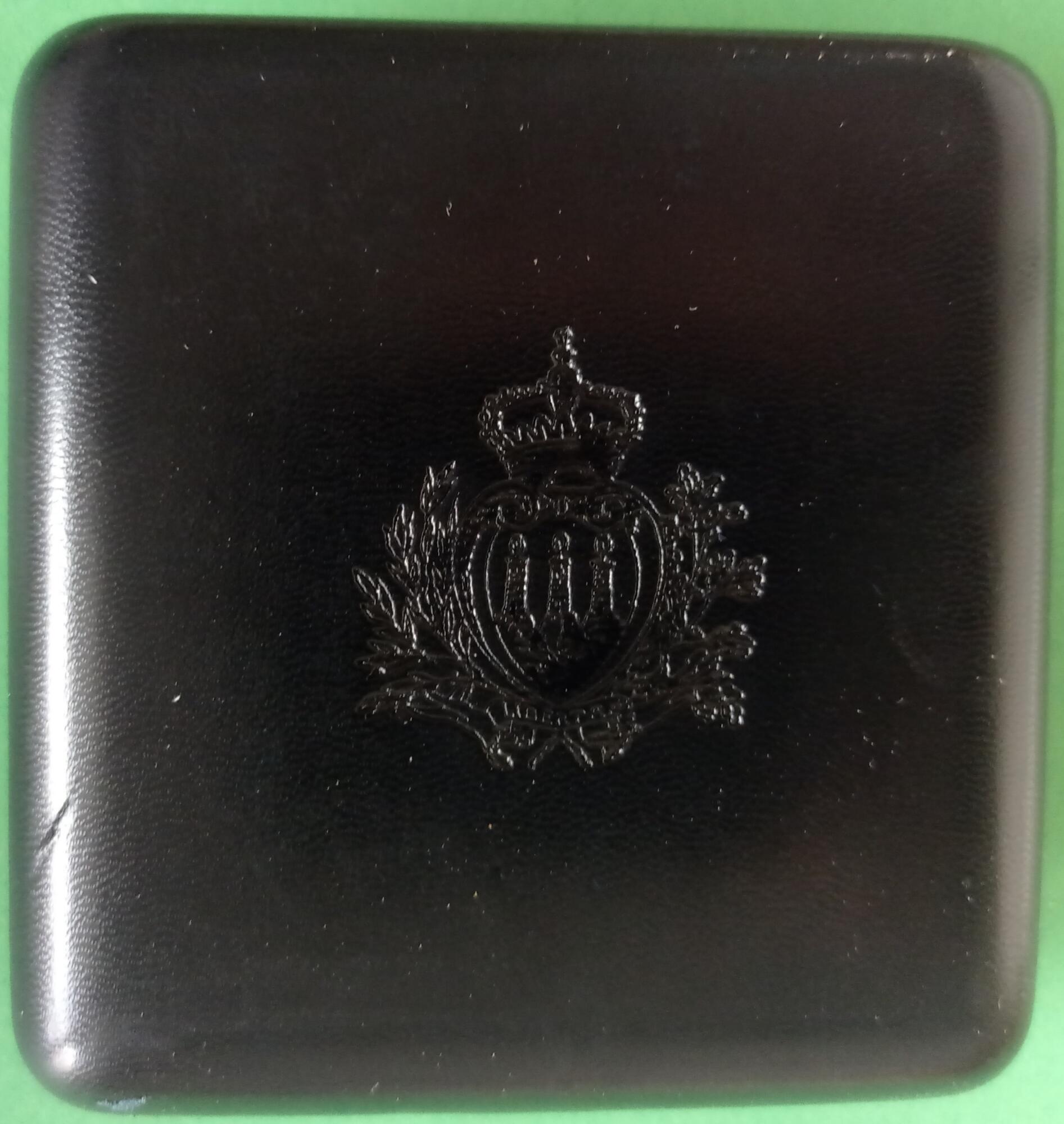 Moneta e astuccio in perfette condizioni, scatola di cartone contenente l’astuccio leggermente macchiata in alcuni punti
