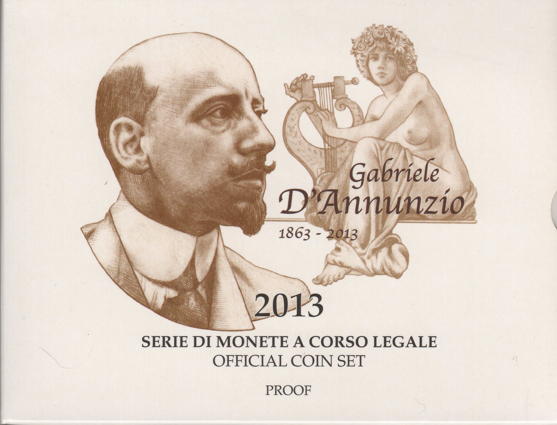 Monete Italia Anno 2013 Serie divisionale Proof con 5 Euro in argento 150esimo anniversario della nascita di Gabriele D’Annunzio