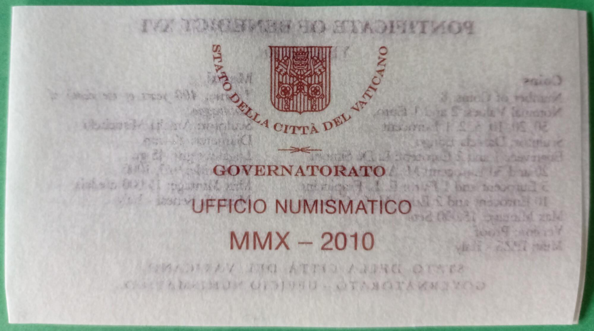 Serie Monete proof Vaticano Anno 2010