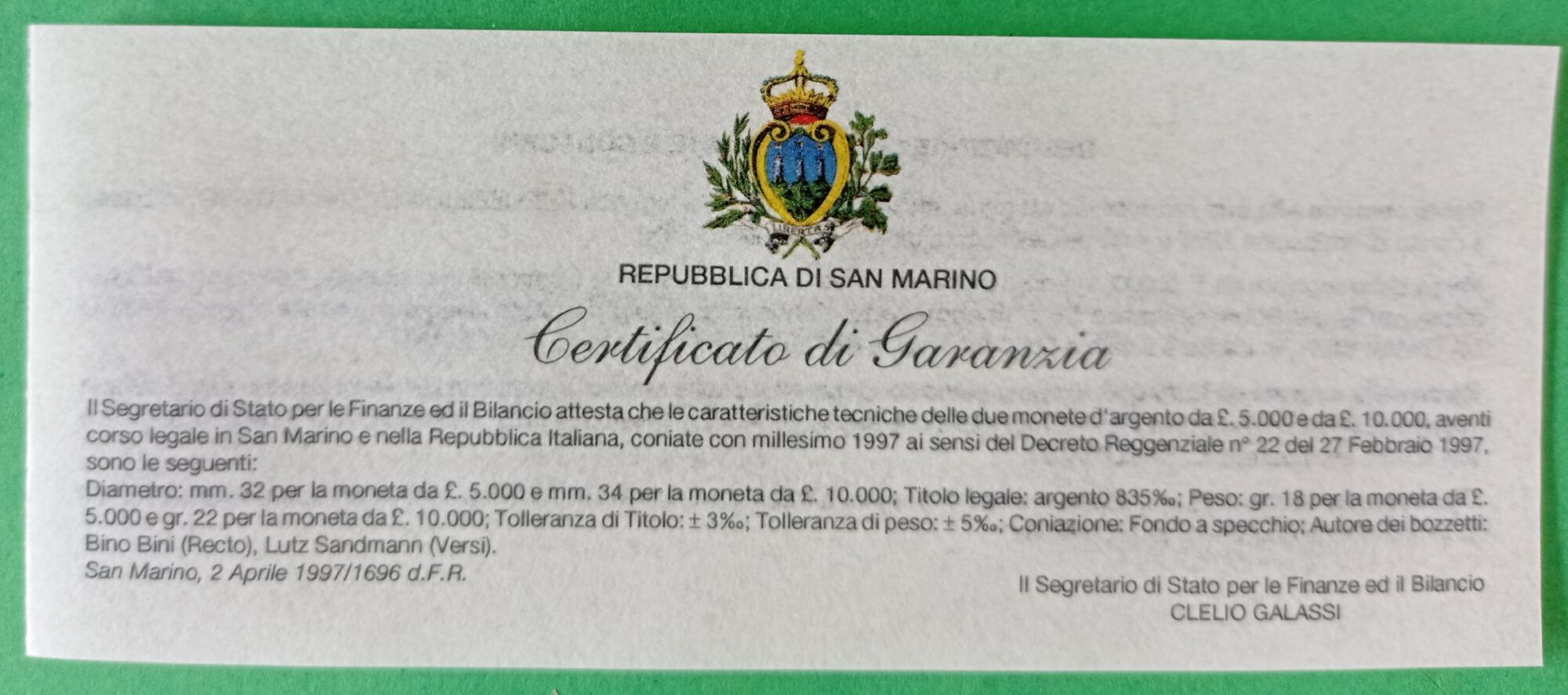 Monete San Marino Anno 1997 Lire 5000 e Lire 10000 Grandi navigatori Giovanni Caboto e Vasco da Gama Proof