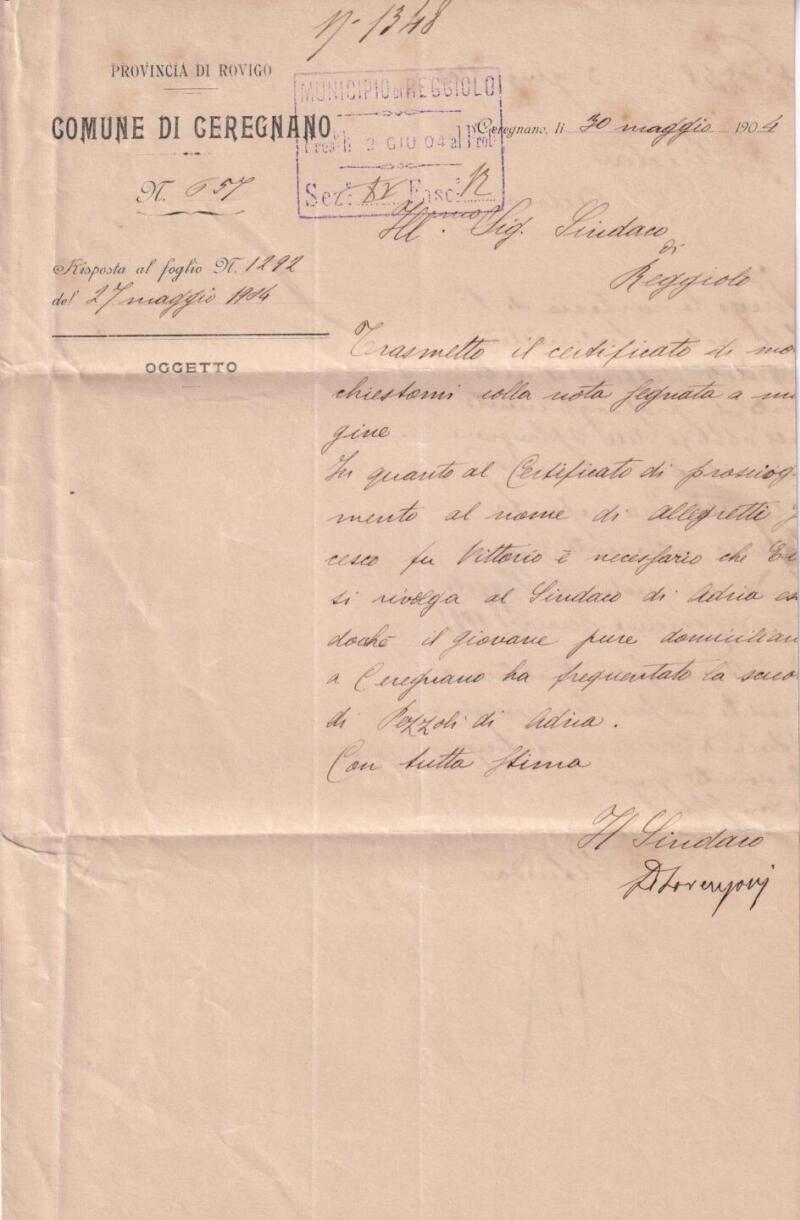 Storia postale  Circolare dal Sindaco di Ceregnano 01/06/1904 (1 GIU 04) a Reggiolo (Regio Emilia) ANNULLO MUTO