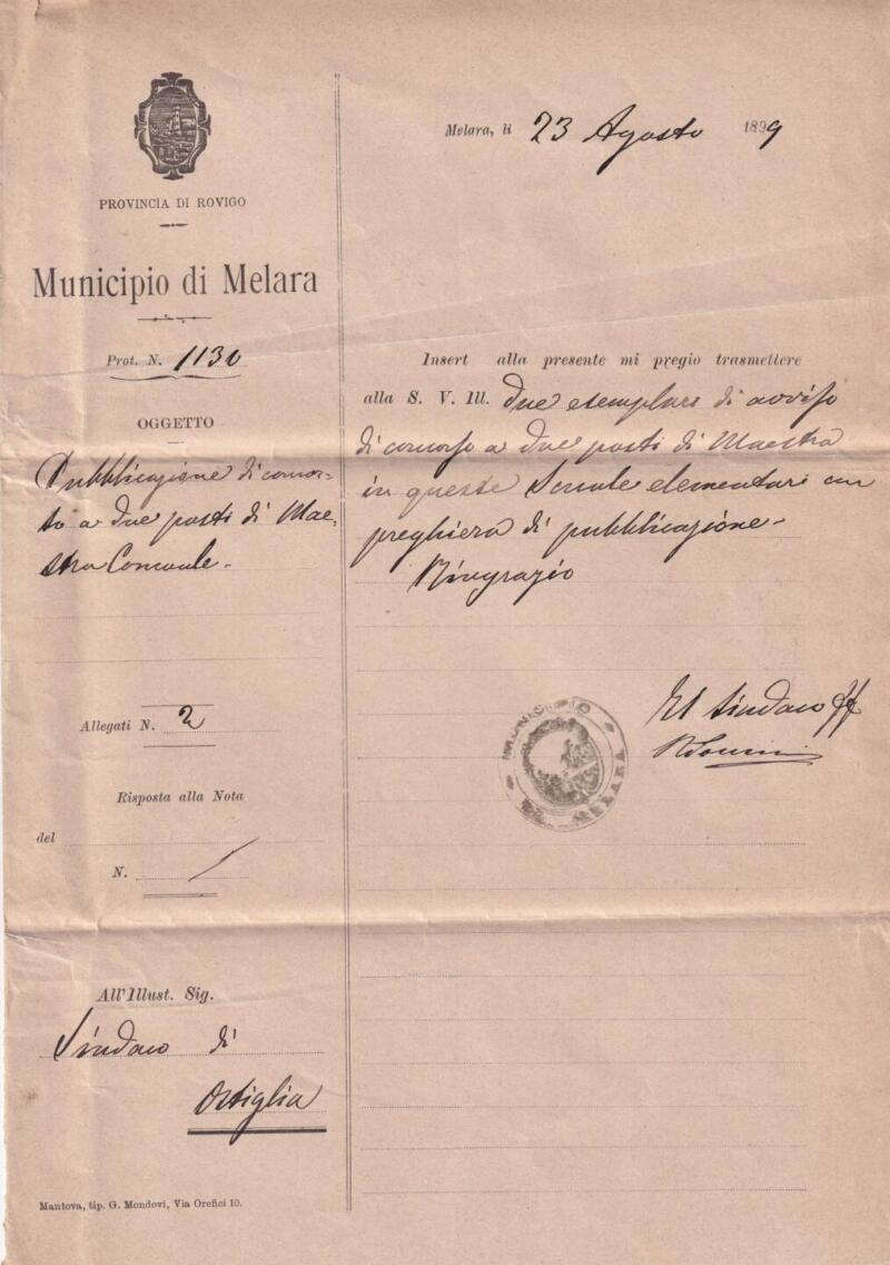 Storia postale  Circolare dal Comune di Melara al Sindaco del Comune di Ostiglia Annullo Muto
