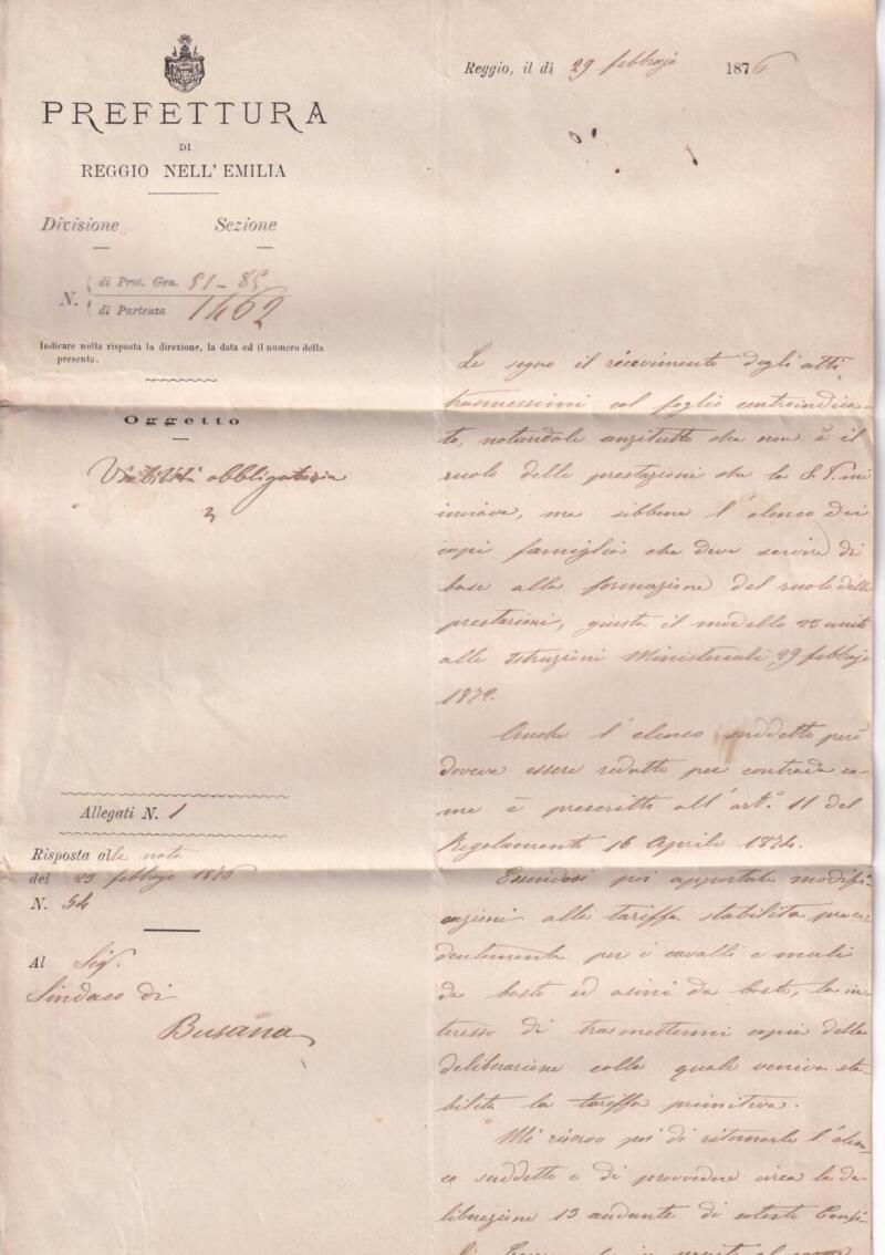 Storia postale Circolare da Prefettura Reggio Emilia 29/02/1876 al Sindaco di Busana –/03/1876 Annullo Muto data piccolo Ovale