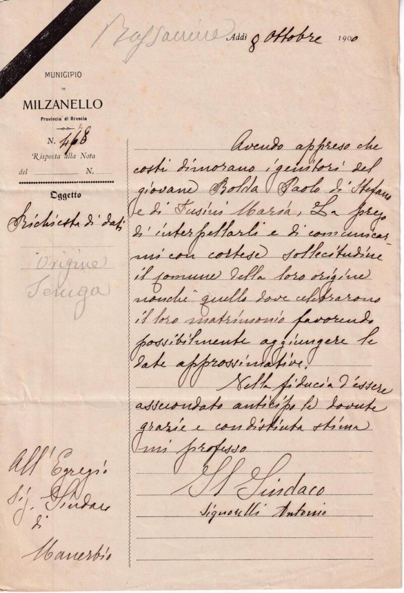 Storia postale  Circolare da Municipio di Milzanello Annullo Muto 08/10/1900 al Sindaco di Manerbio