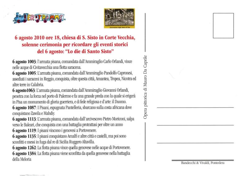 Cartolina Pisa serie Er Tramme Lo die di S. Sisto Pisa 6 agosto 2010 opera pittorica di Mauro Da Caprile