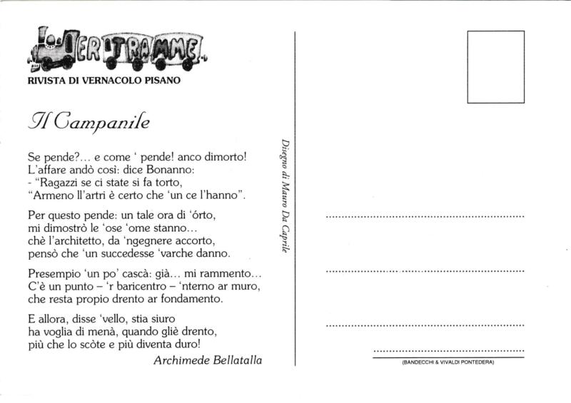 Cartolina Pisa Serie Er Tramme Giugno Pisano 2001 Chiusura del Campanile 7 gennaio 1990 – Riapertura 17 giugno 2001 Disegno di Mauro Da Caprile Con Sonetto di Archimede Bellatalla Il Campanile