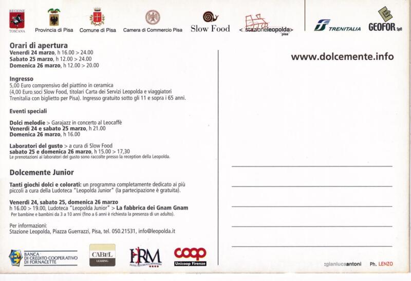 Cartolina Pisa Dolcemente I dolci artigianali tipici pisani Pisa Stazione Leopolda 24/26 marzo