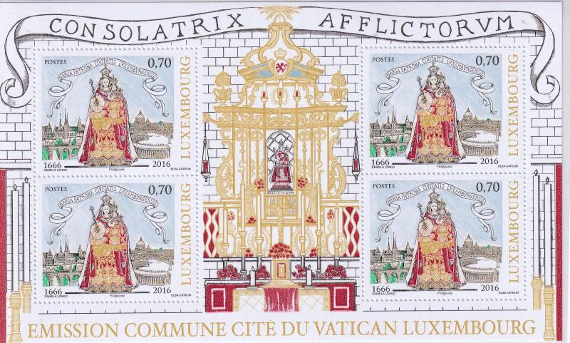 Minifoglio Vaticano, Anno 2016, 350esimo anniversario dell’elezione di Maria Consolatrice degli Afflitti e Patrona del Lussemburgo. Emissione congiunta con il Lussemburgo (MF n. 1747) con la corrispondente emissione del Lussemburgo