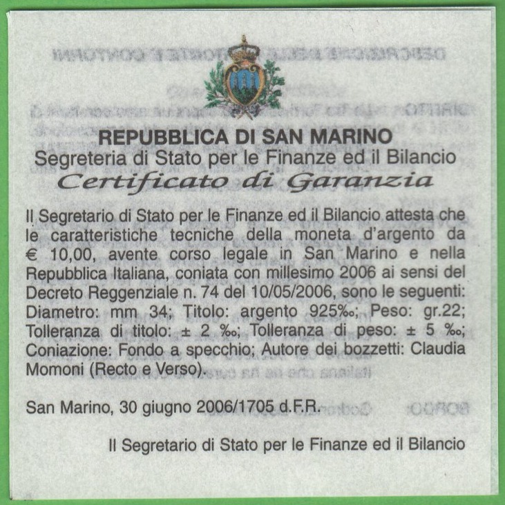 Moneta San Marino Anno 2006 Euro 10 Antonio Canova 1816-2006 Proof