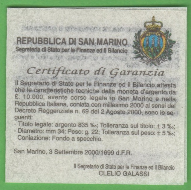 Moneta San Marino Anno 2000 Lire 10000 1700 anni dalla fondazione della Repubblica Proof